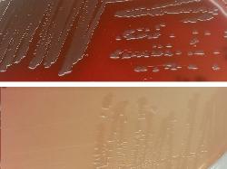 P. fluorescens colonies on Sheep Blood Agar (up) and MacConkey agar (down)