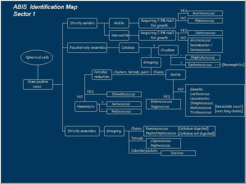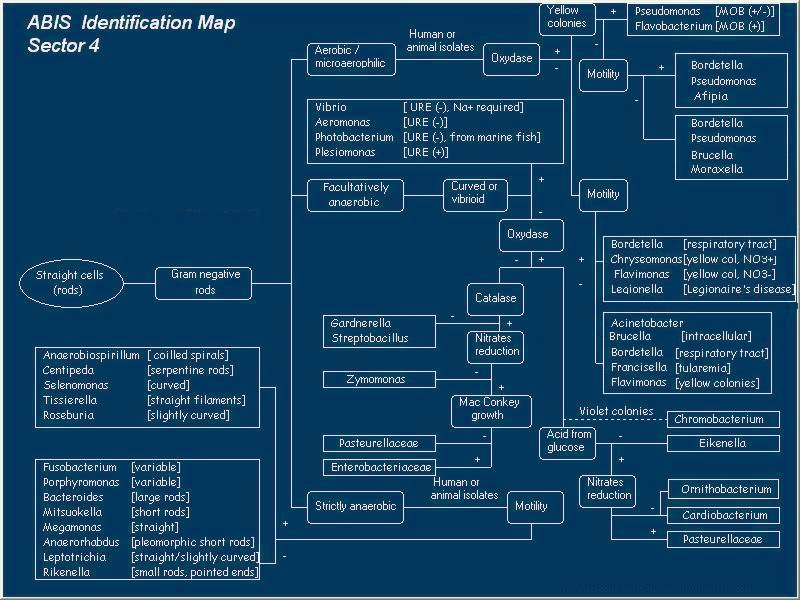| Maps are restricted to Gram-positive and Gram-negative, rods and cocci, human and veterinary significance germs; they have only orientative value. "Plus" and "minus" operators should not be considered as absolute positive or negative discrimination criteria; they represent the comportment of the majority of the taxons. |
