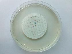Water analysis by membrane filtration on CCA. Legend: blue colonies - E. coli; red colonies - coliforms; colorless colonies: possible Pseudomonas aeruginosa.