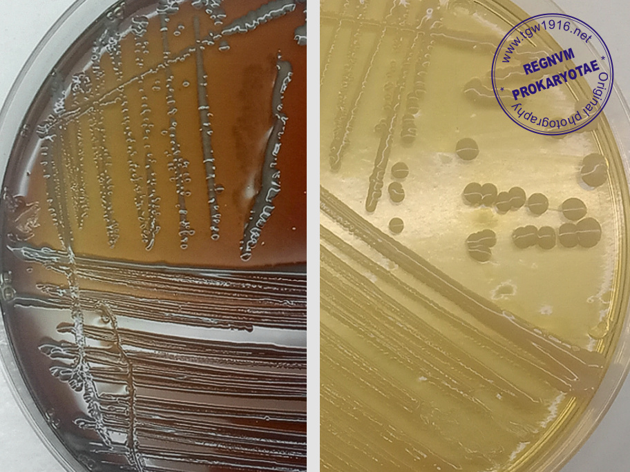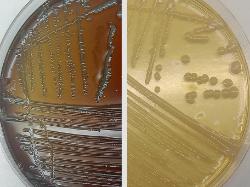 Citrobacter farmeri colonies on Sheep Blood Agar (left) and on BHI Agar (right)