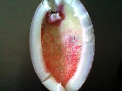 One coconut has been opened and sliced then left at room temperature. After 24 hours a sticky red coloured gel