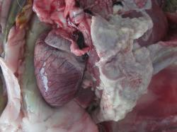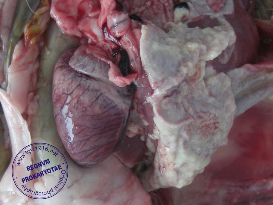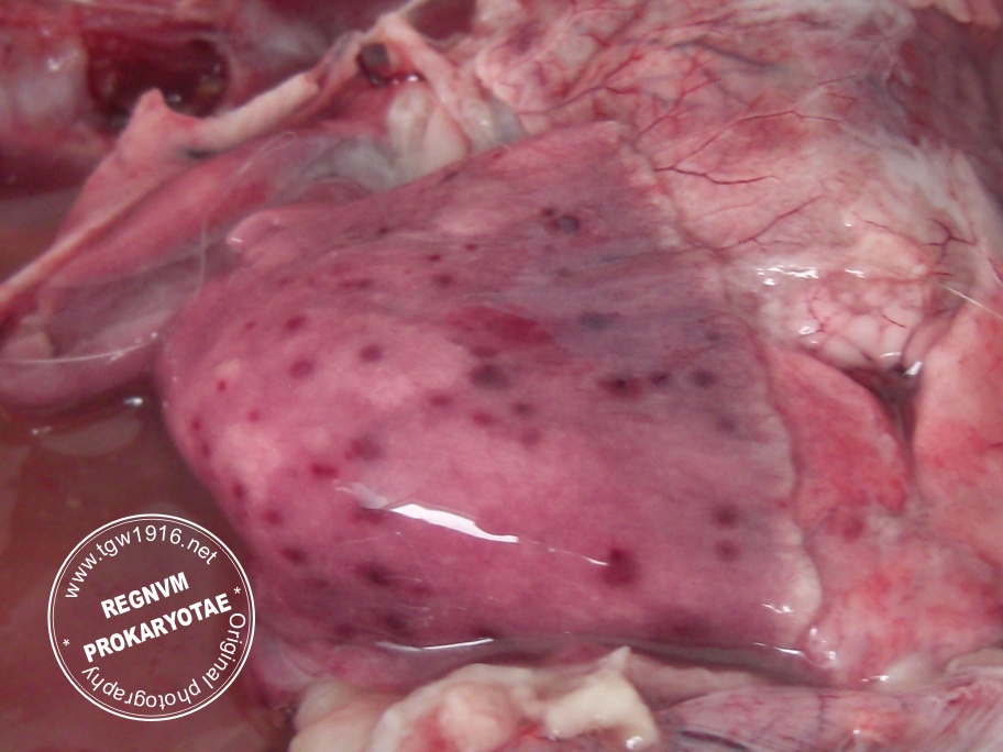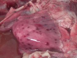 Necropsy revealed fibrinous and haemorrhagic pneumonia with 2-3 mm, haemorrhagic
