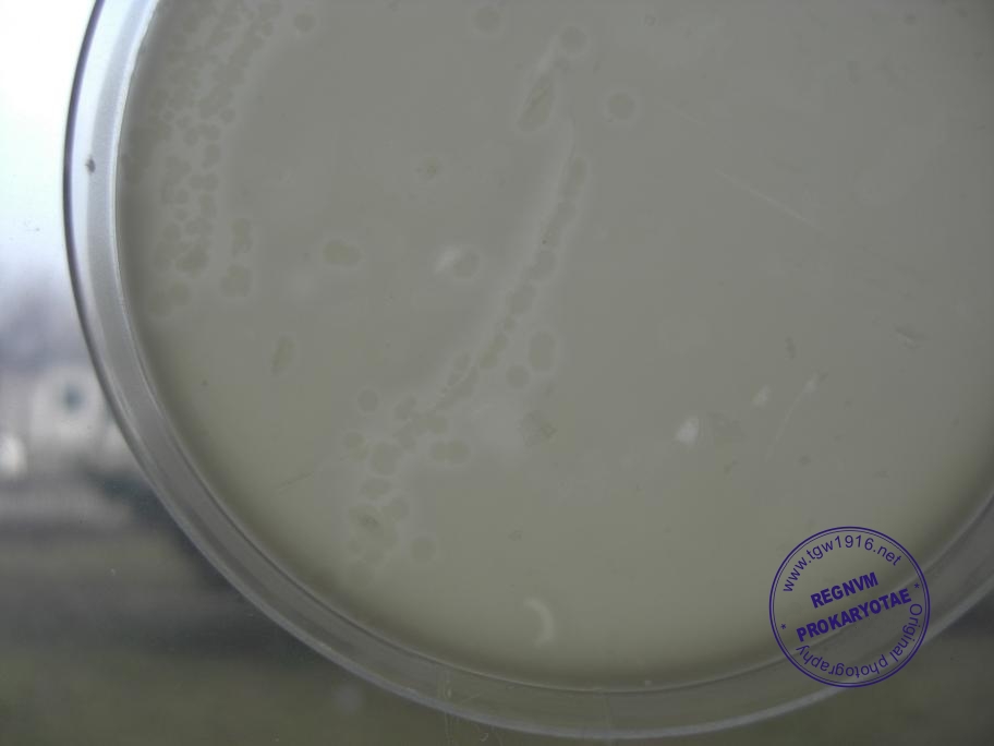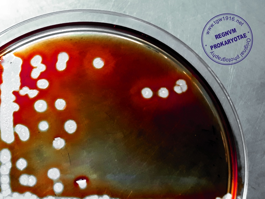 Starch hydrolysis on Mueller-Hinton agar. Light halos around Bacillus subtilis colonies after adding Lugol solution