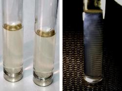 Prepared EMJH medium (left) and Leptospira canicola growth as haze or smoke at the top of the test tube (right)
